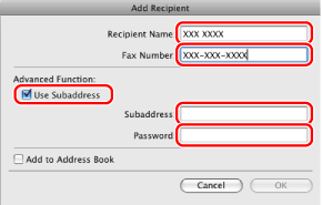 Enter the name and fax number of the recipient in [Recipient Name] and [Fax Number] → select [Use Subaddress] → enter a subaddress and password for the memory box of the recipient's fax.