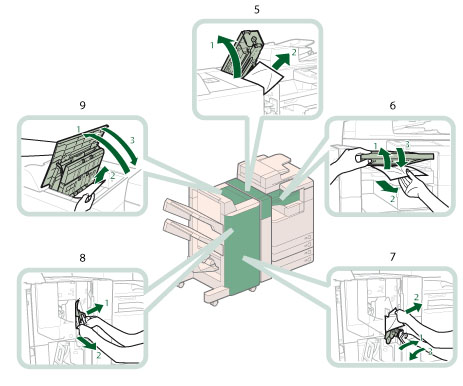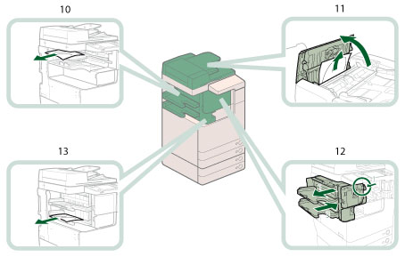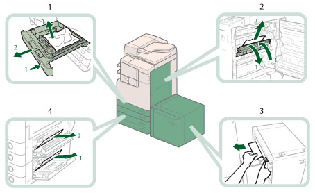 Paper jams may occur in the following parts of the machine. See the applicable section to clear the paper jam.
