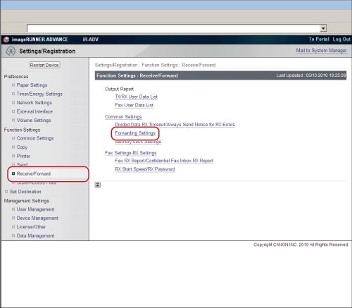 (Settings/Registration) → [Function Settings] → [Receive/Forward] → [Common Settings] → [Forwarding Settings] → [Register] → specify each setting.