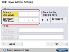 Press (Settings/Registration) → [Preferences] → [Network] → [TCP/IP Settings] → [DNS Settings] → [DNS Server Address Settings].