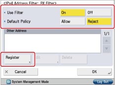Press [On] for <Use Filter> → press [Reject] for <Default Policy> → press [Register].