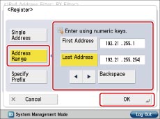 Press [Range Address] → press [First Address] and enter '192.31.255.1' using the numeric keys on the control panel → press [Last Address] and enter '192.31.255.254' → press [OK].