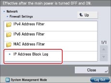 (Settings/Registration) → [Preferences] → [Network] → [Firewall Settings] → [IP Address Block Log].