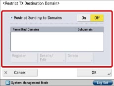 (Settings/Registration) → [Function Settings] → [Send] → [E-Mail/I-FAX Settings] → [Restrict TX Destination Domain].