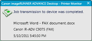 This is displayed during the period from the beginning of spooling executed by the Windows spooler to the completion of a send fax job to imageRUNNER ADVANCE.