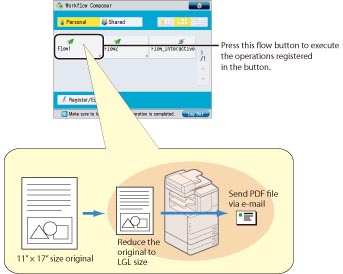For example, you can scan an 11" ×17" original, reduce it to LGL size, and e-mail the file as a PDF by pressing one "flow" button.