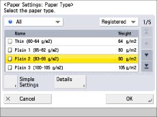 You can select the paper type from the simple or detailed setting screen. For paper types that are not displayed on the simple setting screen, press [Detailed Settings] → select the paper type from the detailed setting screen.
