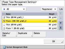 When you register the settings for the custom paper type, make sure to change its name. You cannot change the settings of the default paper types registered in the machine.