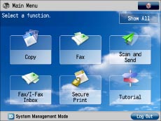 If [Department ID Management] is set to 'On', and if a function restricted by Limit Functions is set for the default screen, the Main Menu screen appears at startup. (If [Department ID Management] is set to 'On', [Copy] is restricted by Limit Functions.) To display the function you set for the default startup screen, select the function on the Main Menu screen → enter the Department ID/PIN on the Log In screen.