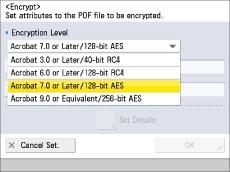 If you select [Acrobat 10.0 or Equivalent], [Acrobat 10.0 or Equivalent/256-bit AES] is displayed when selecting the encryption level.