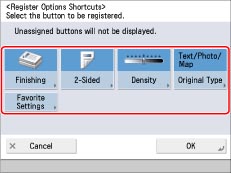 You can create shortcuts to frequently used functions in [Options] in the Copy screen. You can also directly recall buttons registered in [Favorite Settings].