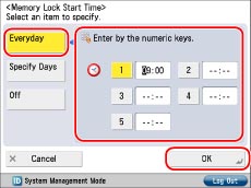 If you select [Off], Memory Lock will not automatically turn on at the specified time. You can manually turn Memory Lock On or Off by pressing [On] or [Off] under <Fax Memory Lock> or <I-Fax Memory Lock> on the Memory RX Inbox screen.