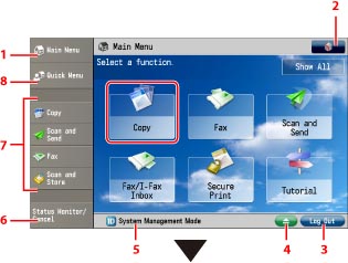 Display the Main Menu screen. If the Main Menu screen is not displayed when using a function, it is necessary to press [Main Menu] before operating the machine. If you want to display all functions, press [Show All].