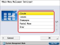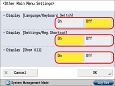 To specify the settings of the Main Menu screen, you must log in to the machine as an administrator. As a default, system manager settings (System Manager ID/System PIN) are set on the machine. Thus, the administrator must log in by entering the System Manager ID and the System PIN on the Settings/Registration screen. The default setting for both the System Manager ID and System PIN is '7654321'.