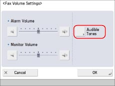 on the control panel enables you to adjust the fax sending/receiving alarm volume and transmission volume. You can also set various tones to sound according to the operations performed or status of the device.