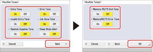 [Memory RX/TX End Tone] and [MemoryRX/TX Error Tone] can be set when the Fax function is available. For information on the optional products required to use the Fax function, see "Optional Products Required for Each Function."