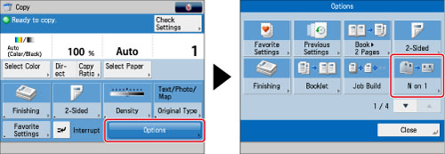 This setting reduces four 1-sided originals or two 2-sided originals to fit on one side of a sheet of paper.