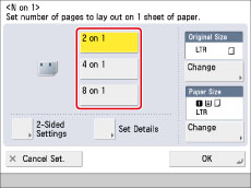 This mode enables you to output multiple scanned originals or two-sided originals arranged on one sheet of paper. You can select 2, 4, or 8 scanned originals to arrange on the page. You can also set two-sided copies and change the layout and order of images.