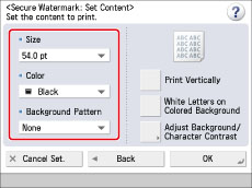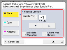 The [Adjust Background/Character Contrast] setting is canceled when the job is complete. If you want to use the same settings for the next copy job, specify the setting again.