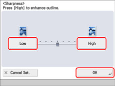 To scan text or lines clearly, the setting should be towards [High]. To scan originals containing printed images or other halftones, the setting should be towards [Low].