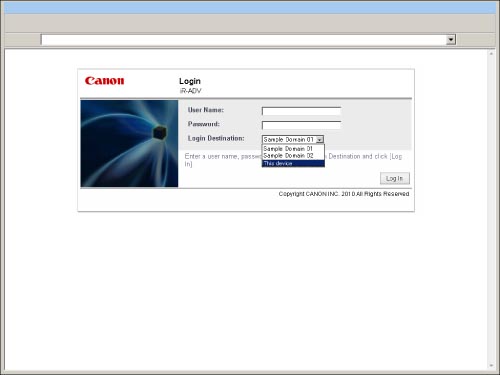 Select the login destination, and enter a user name and password to log in to the Remote UI or a MEAP application (including login applications).