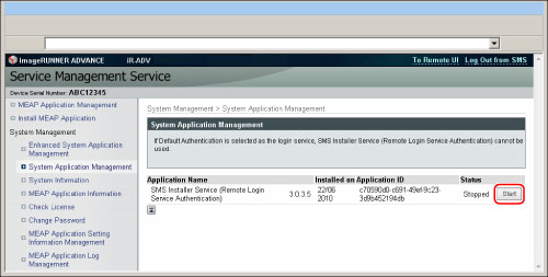 Click [Start] or [Stop] for the application that you want to start/stop.