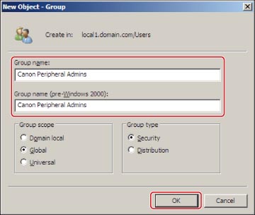 In the [New Object - Group] dialog box, enter the group name ('Canon Peripheral Admins') → click [OK].