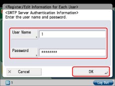 Enter the user name and password used for SMTP Server authentication → press [OK].
