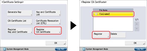 Apart from the X.509 (DER) format CA certificate preinstalled in the machine, you can also register a CA certificate file which has been installed using a Web browser (Remote UI).