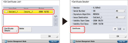Select the key pair for the CA certificate you want to confirm → press [Certificate Details] → [Certificate].