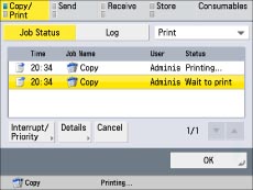 You can set the screen displayed when [Status Monitor/Cancel] is pressed in [Default Screen (Status Monitor/Cancel)] in [Preferences] (Settings/Registration). (See "Default Screen (Status Monitor/Cancel).")