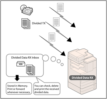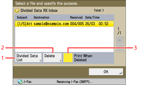 Press to check the status of divided data, and the remaining capacity of the Divided Data RX Inbox.