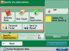 If you set an address type to 'On' in [Limit New Destination], you cannot enter new destinations of that type. Select a stored destination by using the Local Address Book, Remote Address Book, LDAP Server in [Address Book], or by pressing a one touch button in [One-Touch]. (See "Restricting the Send Function.")