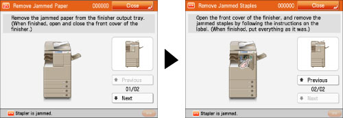 If a staple jam occurs, a screen indicating the location of the staple jam and how to clear the jam appears on the touch panel display. Follow the instructions on the screen to clear the staple jam. The screen is displayed repeatedly until the staple jam is cleared. If you press [Close], you can continue operations, such as setting modes or scanning originals, even if the jammed staple is not removed immediately.