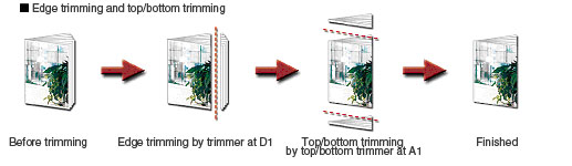 From the [Print Settings] dialog box for the printer driver, display the [Finishing] sheet, select [Fold + Saddle Stitch + Trim] under [Saddle Stitch], and set the trimming width. You may not be able to select [Fold + Saddle Stitch + Trim] depending on the options used. In addition, top and bottom trimming may not be available and edge trimming is only available depending on the options used. You need the optional trimmer for edge trimming. You need the optional trimmer and top/bottom trimmer for three-sided trimming.