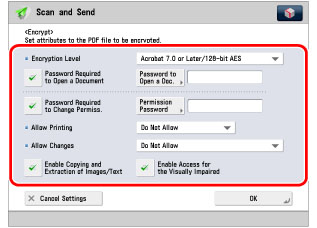 You can encrypt PDF files by setting a password. Only users who enter the correct password can open, print, or change the PDF. To use this function, the Universal Send Security Feature Set is required.
