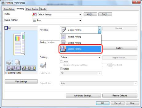In the [Finishing] sheet, select [Booklet Printing] from [Print Style].