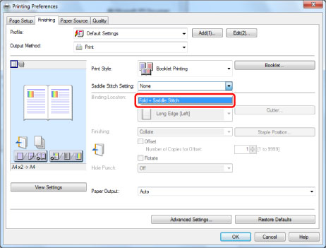 Select [Fold + Saddle Stitch] from the [Saddle Stitch Setting] drop-down list → click [OK] → [OK].