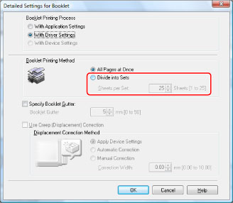 If [Divide into Sets] is selected in the [Detailed Settings for Booklet] dialog box, you can make a batch of 1 to 15 pages and print a booklet. This mode is useful when you print a large number of pages which are difficult to fold.
