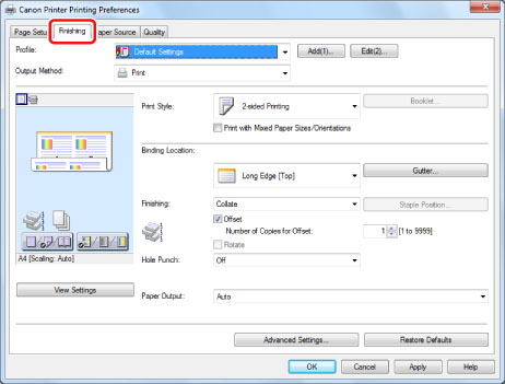 You can print using the same settings each time by specifying default print settings. For example, if the policy of your department is to output only in 2 on 1 printing, you can set the default settings to 2 on 1 printing.