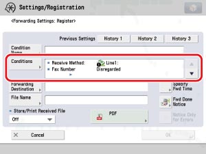 Press [Conditions] → select [Fax: Line 1] from the <Receive Method:> drop-down list → press [OK].