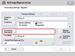 Press [Forwarding Destination] → select the fax number for the office B registered in step 2 from the address book → press [OK].