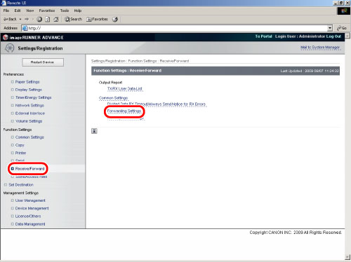 Access the Remote UI → click [Settings/Registration] → [Receive/Forward] → [Forwarding Settings].