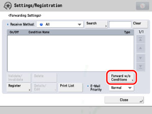 Press (Settings/Registration) → [Function Settings] → [Receive/Forward] → [Common Settings] → [Forwarding Settings] → [Forward w/o Conditions].