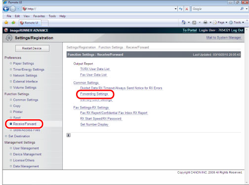 Access the Remote UI → click [Settings/Registration] → [Receive/Forward] → [Forwarding Settings].