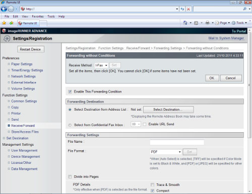 Use Forward w/o Conditions to set a forwarding destination for received faxes that do not match any specified forwarding conditions. This mode enables you to set the file name, select the file format, print when forwarding, and receive notification of forwarding completion.