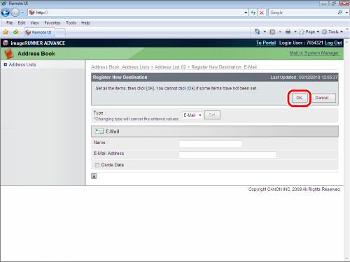 Enter [Name] and [E-Mail Address] → press [OK].
