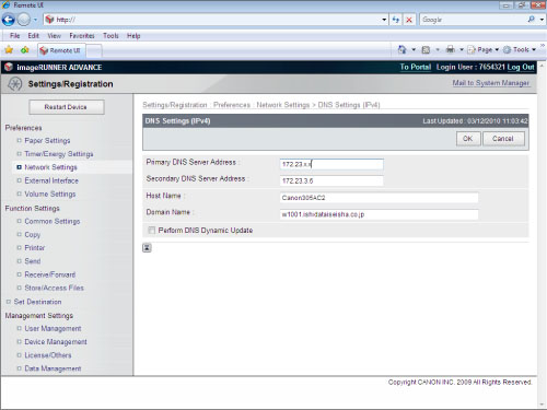 (Settings/Registration) → [Preferences] → [Network] → [TCP/IP Settings] → [DNS Settings].If the imageRUNNER ADVANCE machine continuing to issue packets to the DNS server is causing excessive network traffic, you can disable dynamic DNS updating after communication is complete. However, this is only if you have a server in your company, and your environment is not a DHCP environment (your environment must use fixed IP address and host names).