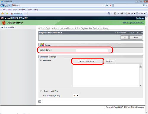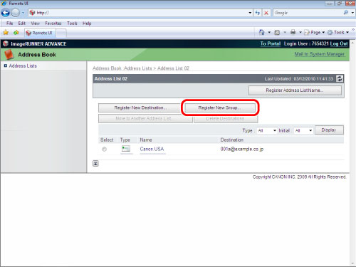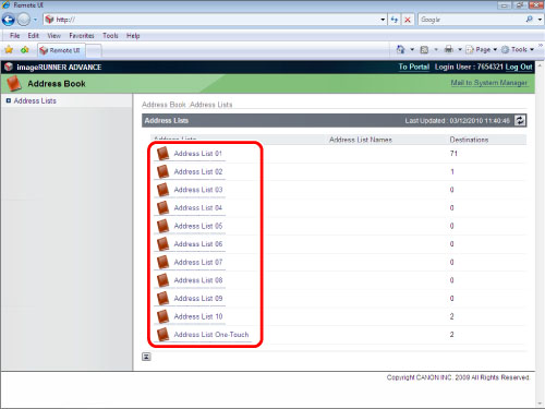 Access the Remote UI → click [Address Book] → select the address list from the list.