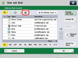 Press [Scan and Send] on the Main Menu screen → [Address Book] → [